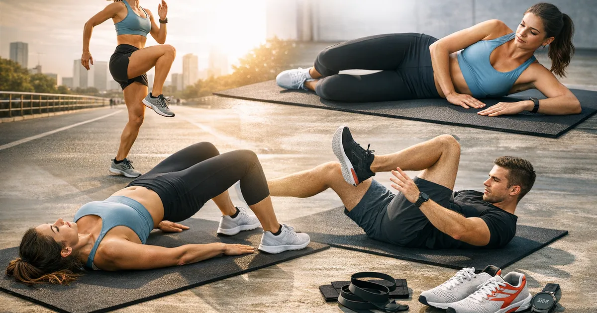 This 15-minute activation routine wakes up your glutes, hips, and core before running. The sequence progresses from lying down to standing to running drills, preparing your body for the demands ahead. Most important before hard workouts; can be shortened for easy runs.