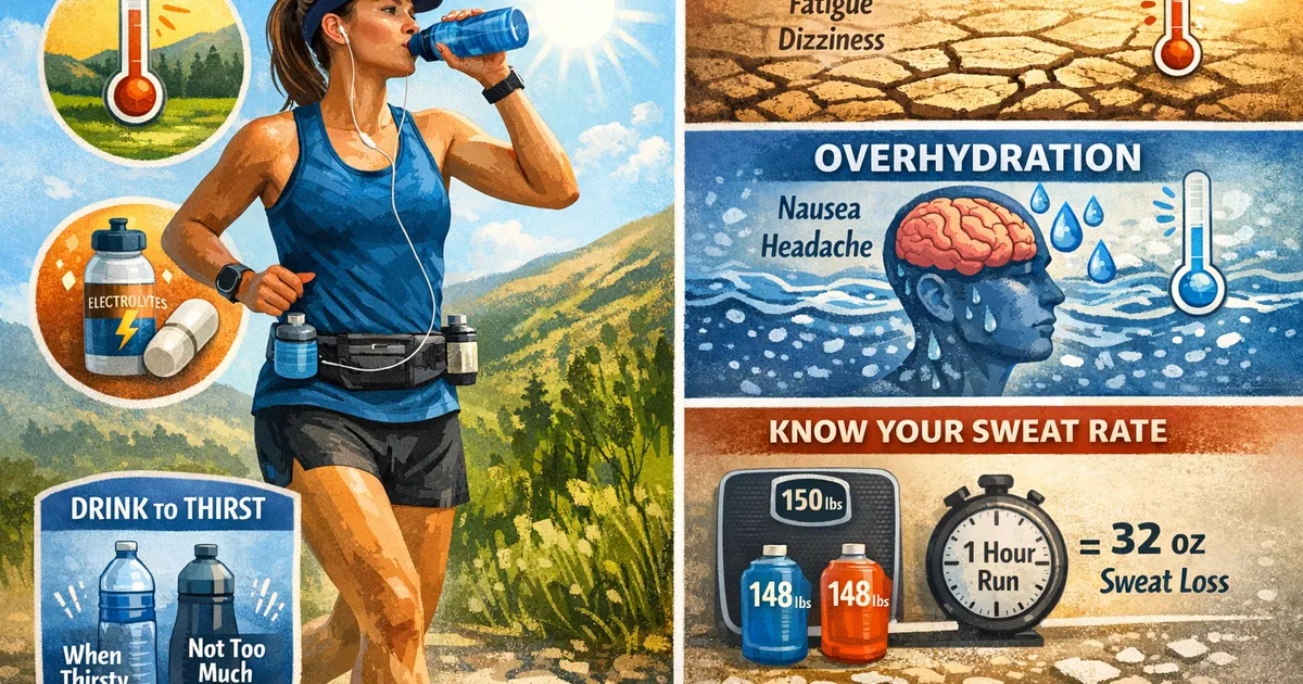 Hydration is simpler than marketing suggests. Drink to thirst, don't force fluids, and add electrolytes for long or hot runs. Mild dehydration during running is normal and tolerable—overhydration is the greater danger. Know your sweat rate for better planning, but trust your thirst.